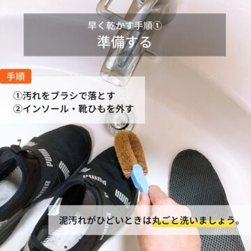 くらしのマーケットは、ぬれた靴を乾かして翌日も履きたい場合の対処法として「『洗濯機での脱水+風を当てる』が正解」だとコメント。ぬれた靴を早く乾かす方法について、次のように紹介しています。