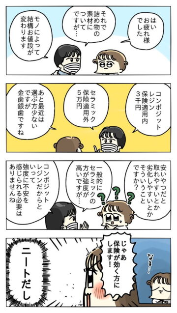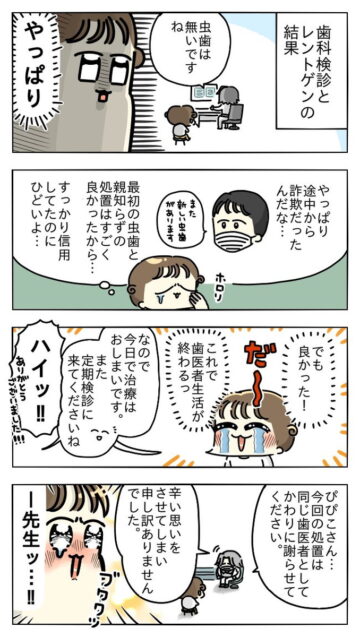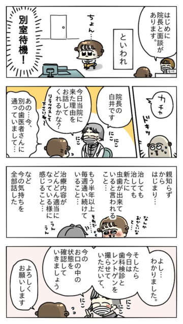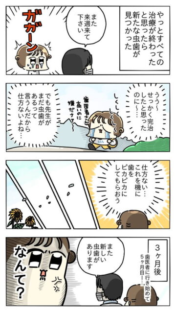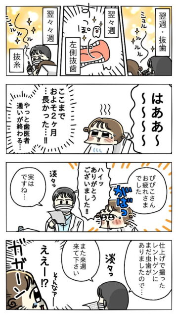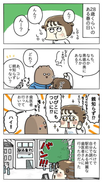 親知らずが気になり始めた作者は、駅前の歯医者に通うことにしました。2カ月間の治療が終わり、「やっと歯医者通いが終わる!」と思いましたが、医師から…という内容で、読者からは「私も歯医者変えました」「セカンドオピニオンは大事!」「信頼できるところを見つけるのが大変ですよね」などの声が上がっています。