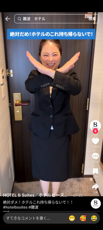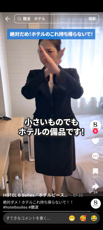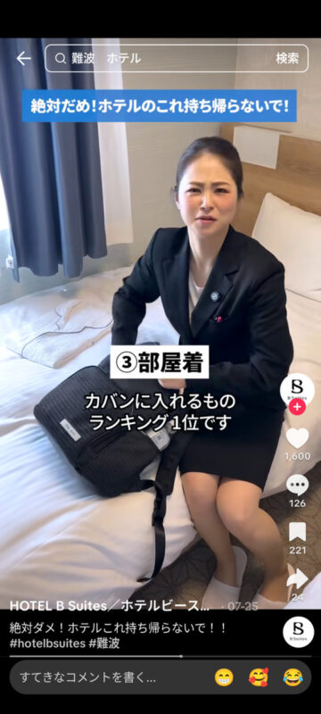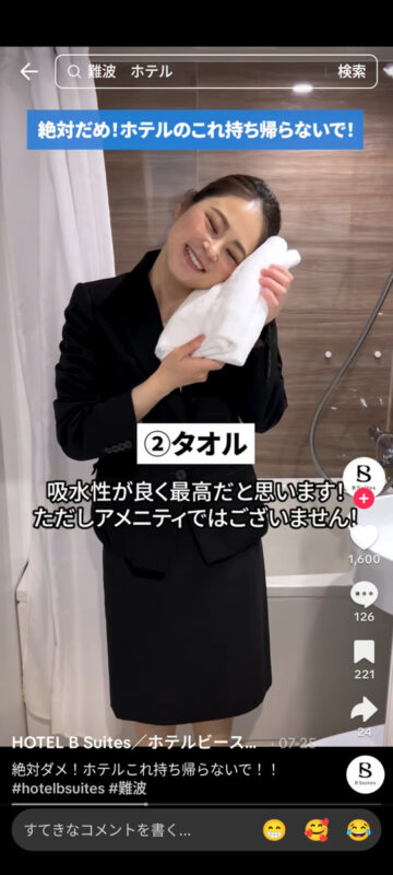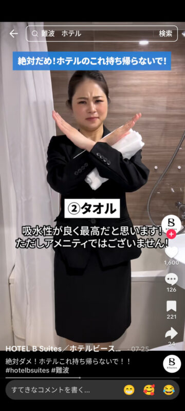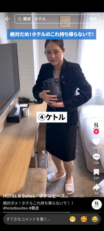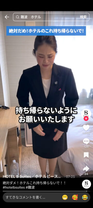 連休中にホテルに泊まっている人は多いと思います。ホテルの宿泊時に絶対に持ち帰ってはいけない客室の備品について、ホテルビースイーツ(大阪市中央区)が公式TikTokアカウントで紹介しています。