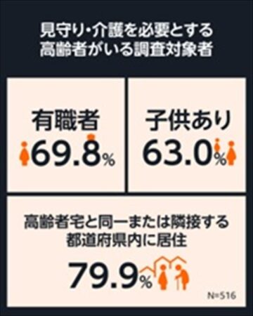 「離れて暮らす高齢者の見守り・介護における音声AIアシスタント活用」を調べた同調査は、8月1~3日、離れて暮らす65歳以上の親や親族の見守り、介護などのサポートに関与していると申告した516人を対象に実施。516人の中で、約7割(69.8%)が公務員・会社員・自営業・パートなどの有職者で、63.0%が子供ありと回答。