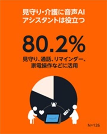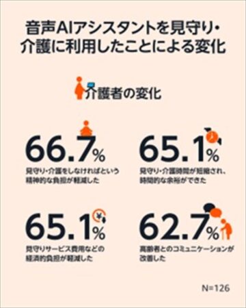 音声AIアシスタントを見守り・介護に利用したことによる調査対象者の変化についても紹介していて、「見守り・介護をしなければという精神的な負担が軽減した」(66.7%)、「見守り・介護時間が短縮され、時間的な余裕ができた」(65.1%)、「見守りサービス費用などの経済的負担が軽減した」(65.1%)、「高齢者とのコミュニケーションが改善した」(62.7%)などが上位に挙げられたということです。