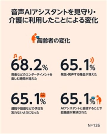 さらに、高齢者の変化については、「音楽などのエンターテイメントを楽しむ時間が増えた」(68.2%)、「発話・発声する機会が増えた」(65.1%)、「通院や投薬などの予定を忘れないようになった」(65.1%)、「AIアシスタントと会話することで孤独感が解消された」(65.1%)が結果として見られたということです。