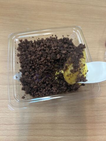 「掘って発見!スイートポテト」は、ファミリーマート初の”体験型スイーツ”です。土に見立てたココアスポンジとクランチに、ミニサイズのスイートポテトが4つ隠れているという商品で、1つだけスイートポテトの色が違い、色違いを見つけられるかドキドキしながら食べることができます。一口食べると、芋の甘さが口いっぱいに広がり、楽しみながら秋の味覚もしっかりと感じることができました。価格は368円(以下、税込み)。