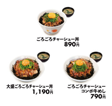 価格は「ごろごろチャーシュー丼」が890円(以下税込み)、「大盛ごろごろチャーシュー丼」が1190円、「ごろごろチャーシューコンボ牛めし」が790円。テイクアウトの場合、「みそ汁」は別途料金。全国の店舗(一部店舗を除く)で販売されます。