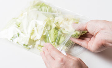 (3)キャベツを冷凍用密閉保存袋に平らに入れ、空気を抜いて薄くして冷凍する。