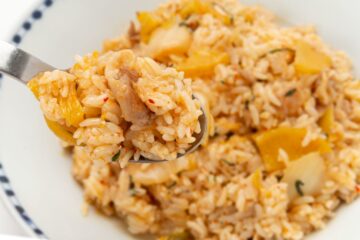「キムタクごはん」と聞くと木村拓哉さんを連想しますが、実は関係ありません。名前の由来は「キムチ」と「たくあん」の組み合わせ。刻んだベーコンと白菜キムチ、たくあんを炒めて薄口しょうゆで味付けし、ごはんに混ぜれば完成する、塩尻市で生まれたオリジナル給食メニューです。