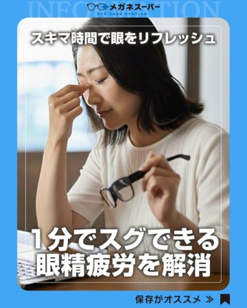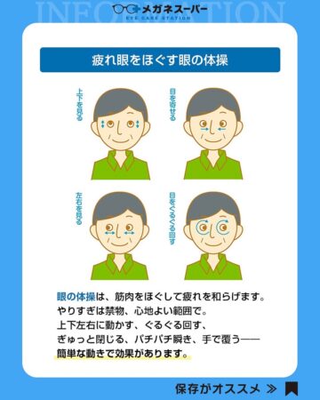 眼精疲労を解消する方法について、眼鏡やコンタクトレンズなどを販売するメガネスーパーがインスタグラムの公式アカウントで紹介しています。
