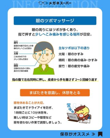 投稿では、他に指の腹で目のツボをマッサージする方法も紹介しています。ぜひ実践してみてはいかがでしょうか。