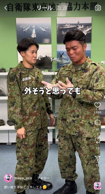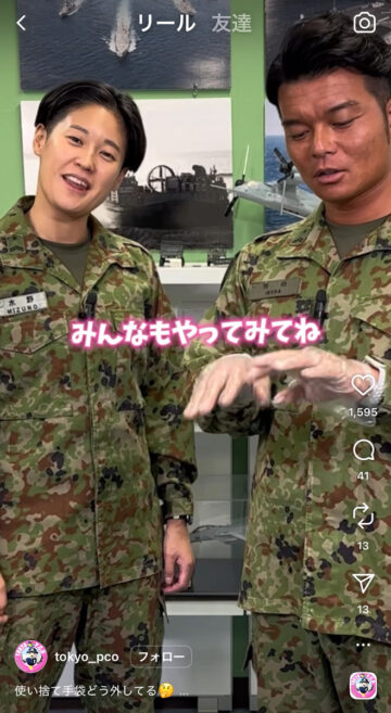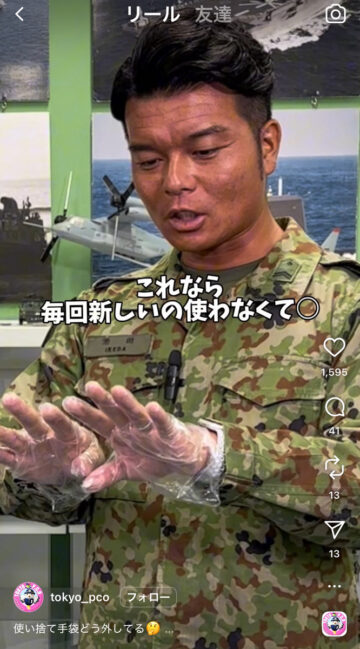 掃除のときに使い捨ての手袋を使う人は多いと思います。その際、作業を中断して手袋を一度取り外したときに表面と裏面が分からなくなり、やむなく新しい手袋に交換していませんか。作業中断時に使い捨て手袋を上手に取り外す方法について、自衛隊東京地方協力本部(以下、自衛隊)がインスタグラムの公式アカウントで紹介しています。