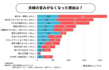 夫婦の営みが「ない」と回答した人(1608人)に「夫婦の営みがなくなった理由」を聞いた結果(複数回答)、圧倒的トップとなったのは「疲れる・面倒」(445人)でした。これは「ない」と回答した人の27.67%にあたります。次いで「自分がしたくなくなった」(359人)と続きました。