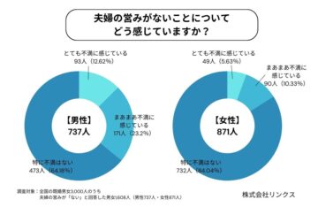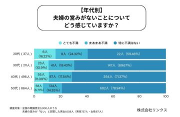 一方で、「夫婦の営みがないことについてどう感じているか」についての質問(3択)では、「特に不満はない」が1205人(74.94%)で最多に。次いで「まあまあ不満」が261人(16.23%)、「とても不満」が142人(8.83%)という結果になっています。全体では7割超が「不満はない」と回答しているものの、男女別では差が顕著となり、男性の不満率(35.82%)が女性(15.96%)の倍以上となりました。