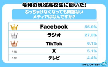 調査結果を受けて、同社は「1位のFacebookと2位のラジオで、8割以上の回答があった今回の調査。高校生にとってはこの2つのメディアはオワコン化メディアの代表となってしまいました。40代・50代にとっての『ポケベル』『PHS』などの存在が、令和の高校生にとっては『Facebook』『ラジオ』なのかもしれません」とコメントを寄せています。