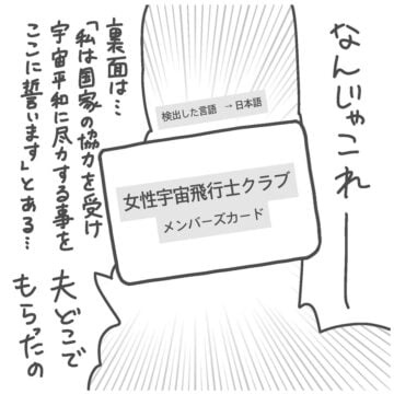 pekoさん「夫の枕元で偶然見つけたメンバーシップカードに書かれている文字の意味が分からず、『何か後ろめたいカードなのかな?』と思い、調べました。すると、『女性宇宙飛行士クラブ メンバーズカード』という、イヤらしく取ろうと思えば取れる絶妙な名前で焦りました」