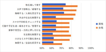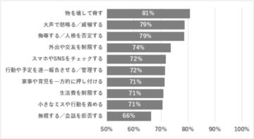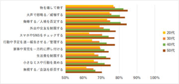 その結果、全体で最も多くの回答を集めたのは「物を壊して脅す」(81%)でした。次いで、同率で「大声で怒鳴る/威嚇する」と「侮辱する/人格を否定する」(各79%)、「外出や交友を制限する」(74%)と続いています。強い攻撃性のある行為は高確率でモラハラとみなされる一方、いわゆる「束縛系」の行為も、多くの人がモラハラと認識している実態が浮き彫りとなりました。