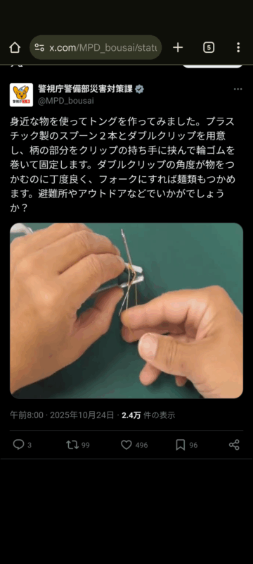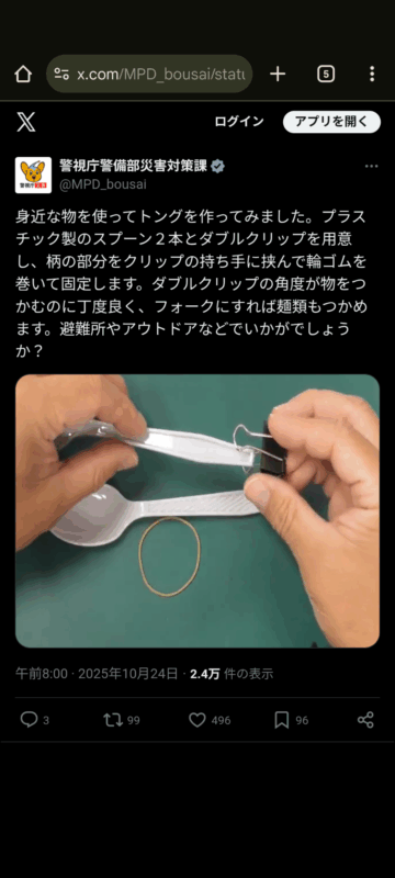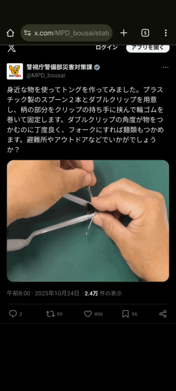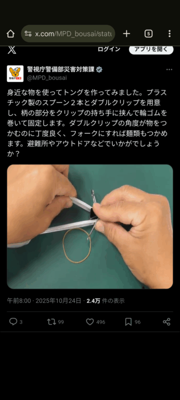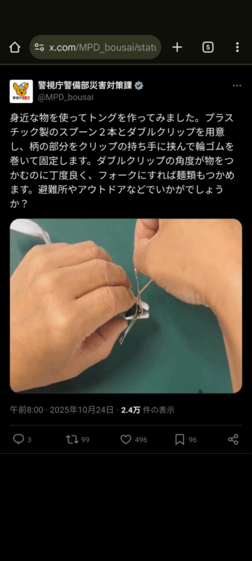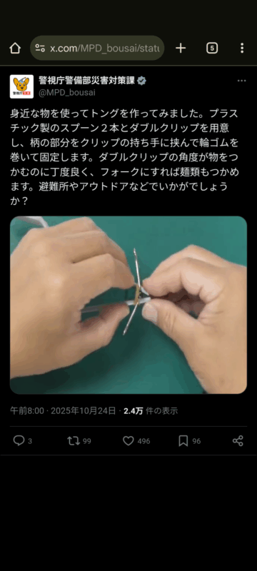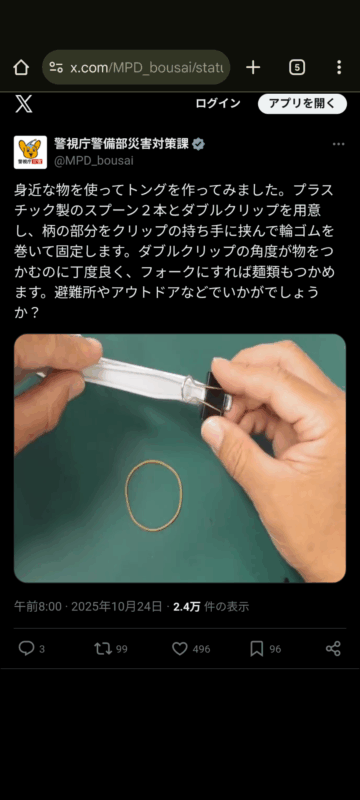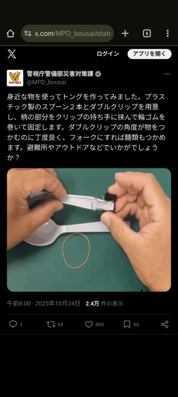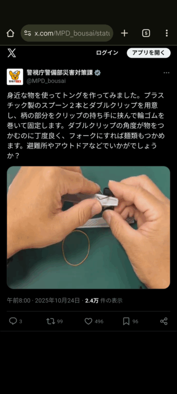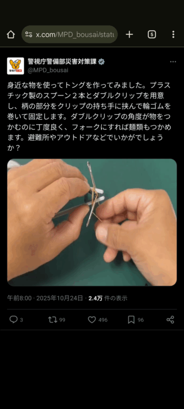 プラスチック製のスプーンを使ってトングを作る方法について、警視庁警備部災害対策課がXの公式アカウントで紹介しています。