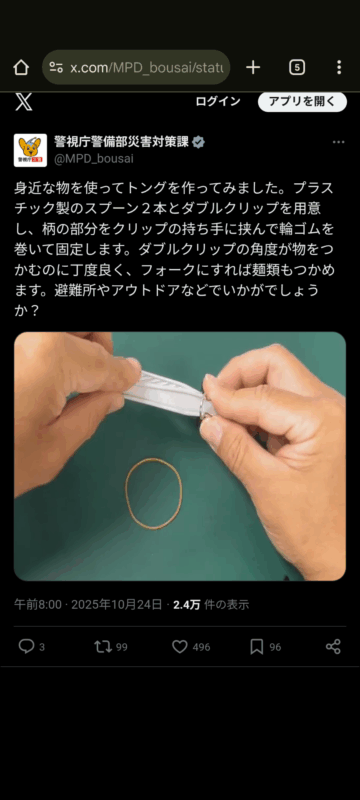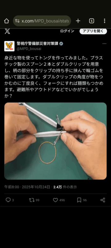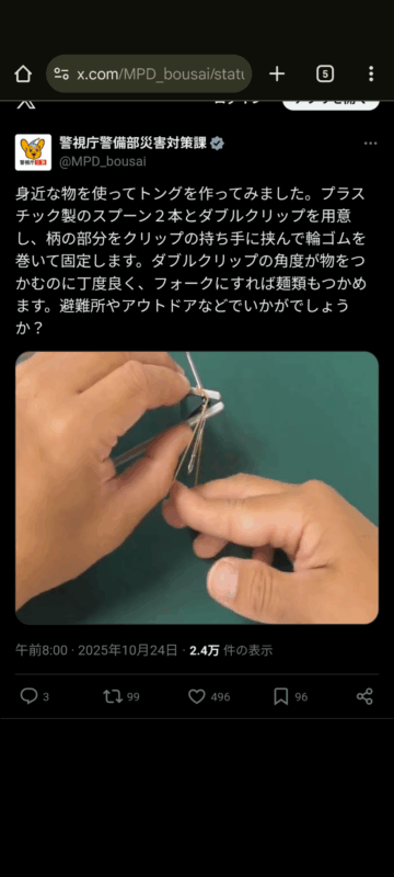 警視庁は「身近な物を使ってトングを作ってみました」と投稿。トングの作り方について、「プラスチック製のスプーン2本とダブルクリップを用意し、柄の部分をクリップの持ち手に挟んで輪ゴムを巻いて固定します」と解説しています。