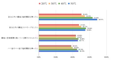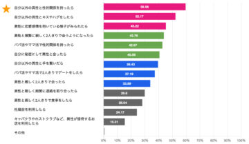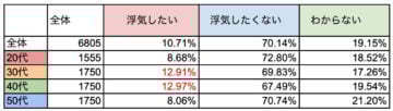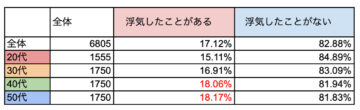 男女別で比較すると、女性の方が「疑ったことがある」「浮気したことを知っている」と回答する人が多い結果に。また、世代別では、若い世代の方が「疑ったことがある」という人が多く、平均を上回っていたほか、20代については「浮気したことを知っている」割合も多くなったということです。