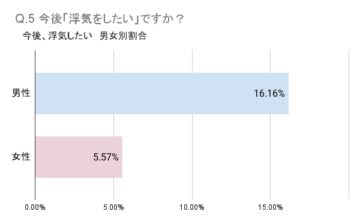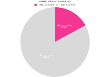 全回答者に「結婚後、浮気をしたことがあるか」を聞いたところ、「ない」と回答した人が82.88%を占めた一方で、「ある」と答えた人も全体の17.12%に上り、10人に1〜2人の割合で「浮気をしたことがある」という結果になりました。