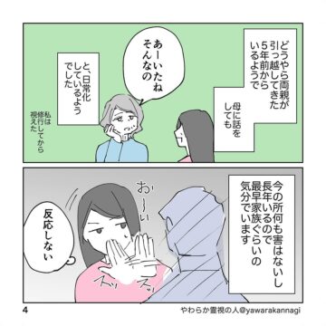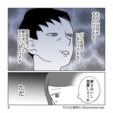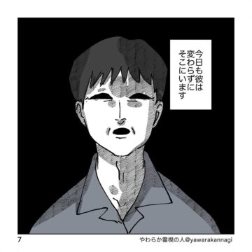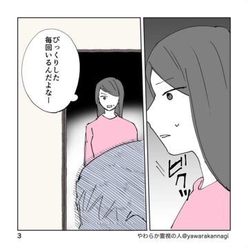 作者が実家に帰省すると、部屋の角に必ずいるおじさんの霊。どうやら両親が越してきた5年前からずっといるようで…という内容で、読者からは「そこにいる理由は何なのだろう…」「最後のページが怖すぎる」などの声が上がっています。