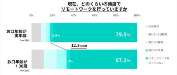 また、リモートワークといった「おうち時間」が長い人ほど、“お口年齢”が実年齢より高くなる傾向もみられています。具体的には、“お口年齢”が実年齢に近い人のうち、「リモートワークは週1回未満」と回答した人が82.4%だったのに対し、お口年齢が実年齢より30歳以上高い人ではその割合が70.1%に上りました。