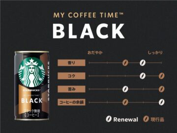 ブラックは、日本のスターバックス「Ready To Drink(RTD)」 用に厳選した高地産のアラビカ豆を使用し、苦みや渋みは抑え、香り豊かなブラックコーヒーを意識。香ばしく広がる香りと、深いりならではの奥深い余韻をゆっくり楽しめる味わいにリニューアルしました。