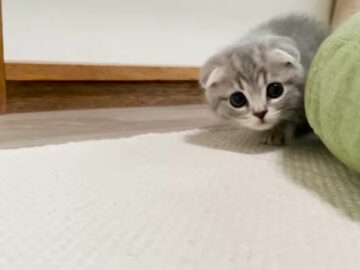 注目を集めたのは「クッションからとろける子猫が可愛すぎた…」という動画。登場する子猫は、スコティッシュフォールドの「ルル」です。クッションから顔をのぞかせるルルの姿から動画は始まります。