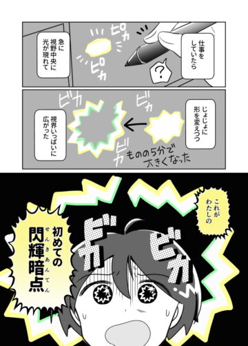 【漫画】仕事中、突然視界に広がった「ギザギザの光」… “閃輝暗点”のリアルな見え方と、医師からの注意点