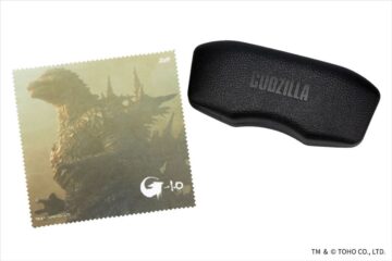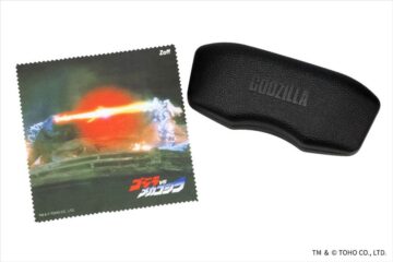 ゴジラの表皮を彷彿とさせる黒くデコボコのあるメガネケースと、各作品の象徴的なビジュアルがプリントされたメガネ拭きがセット。価格はいずれも1万5500円(税込み)です。