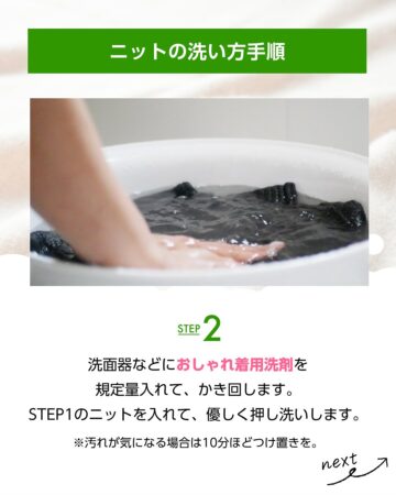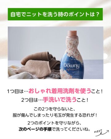 リネットの公式インスタグラムは、ニットを洗う際、「おしゃれ着用洗剤を使う」「手洗いで洗う」の2点を守らないとニットが傷んでしまったり、毛玉が発生したりする恐れがあると説明。ニットの洗い方について、次のように紹介しています。