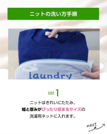 (1)ニットはきれいに畳み、幅と厚みがぴったり収まるサイズの洗濯用ネットに入れる。