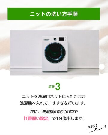 (3)ニットを洗濯用ネットに入れたまま洗濯機へ入れて、すすぎを行う。次に、洗濯機の設定の中で「1番弱い設定」で1分脱水する。