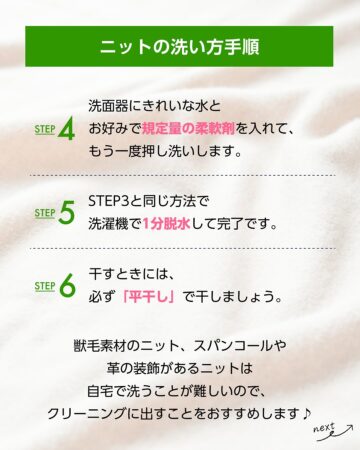 なお、獣毛素材のニット、スパンコールや革の装飾があるニットは自宅で洗うことが難しいため、クリーニングに出すのがお勧めとのことです。