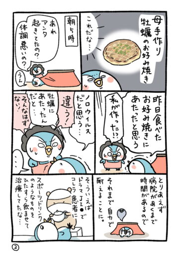 ある日の夜中、作者は急な吐き気で目が覚めました。その後も吐き気は治まらず、朝までに何度もトイレに行くことに。「なぜ急に?」と思い返すと…という内容で、読者からは「私も何度もなったことがあります」「本当に怖い」「私も一度体験してから食べられなくなりました」などの声が上がっています。
