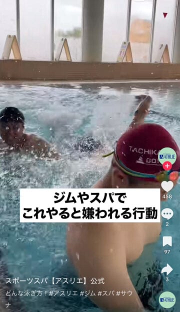 スポーツジムのプールや更衣室でやると他の人に迷惑を掛ける行為について、総合フィットネスクラブ「スポーツスパ アスリエ」の公式TikTokアカウントが紹介しています。