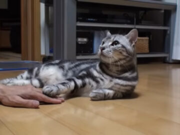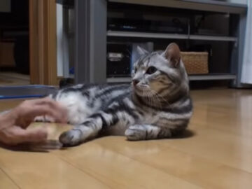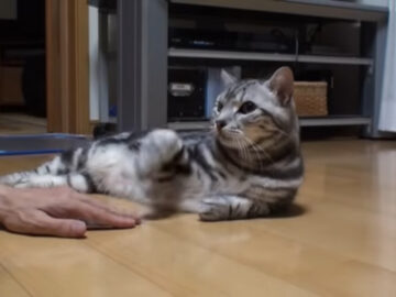 飼い主が猫の前足に優しく手を乗せようとすると、それをかわすかのように飼い主さんの手の上にスッと乗せ返す猫。それが延々と繰り返される修行のような光景に、「まだまだ脇が甘いニャ」というセリフが聞こえてきそう。