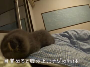 注目を集めたのは「子猫が球体になりました…スコティッシュフォールドのつむ」という動画。朝方、飼い主が目を覚ますと、布団の上に鎮座している謎の球体を発見します。その正体は、体を丸めてスヤスヤと寝むる「つむ」でした。
