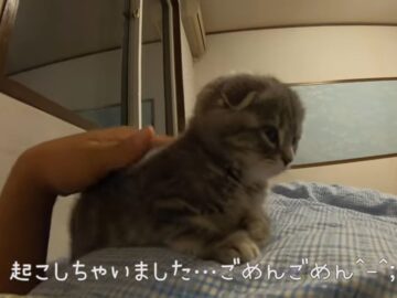 目が覚めたら布団の上にナゾの球体が! 優しくなでられ“ウトウトお休みモード”の子猫に反響「もう天使だなぁ」「小さくてかわいい!」