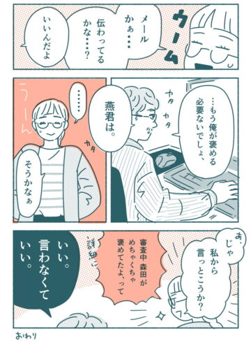 オオカミ タホさん「デザイナーさんから、『自分も人と比べて苦しいときがあるので励まされた』という感想をいただき、うれしかったです。また、『昔の上司を思い出した。あの人のおかげで今がある』という人もいらっしゃいました。デザイナーに関わらず、読んでくださった人それぞれが、ご自身の人生の今や過去を少しでも肯定できたならうれしいです」