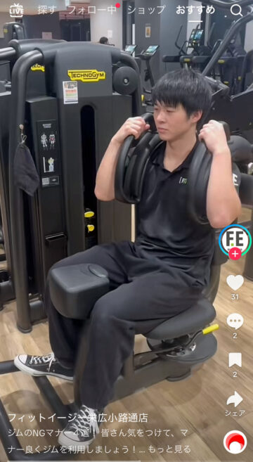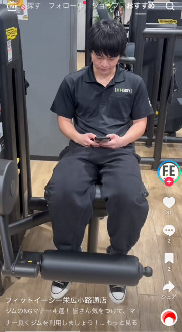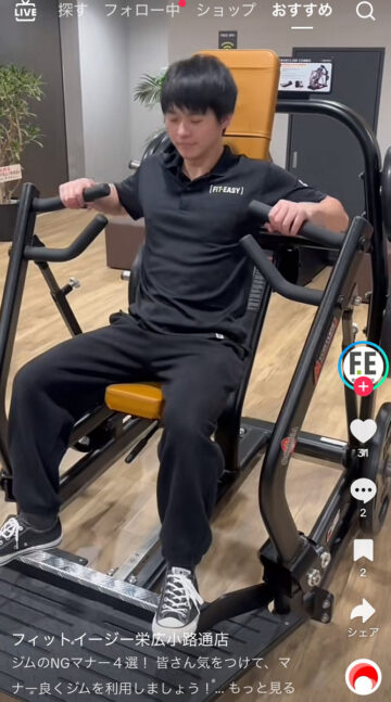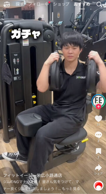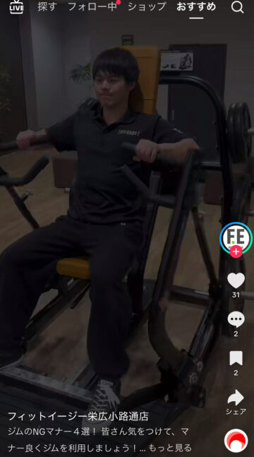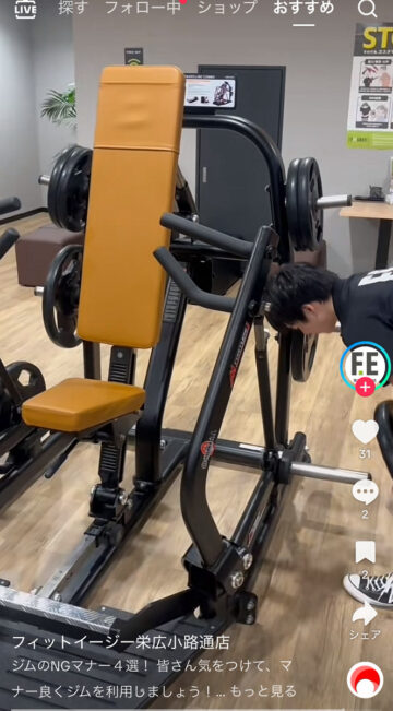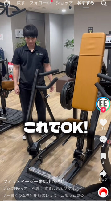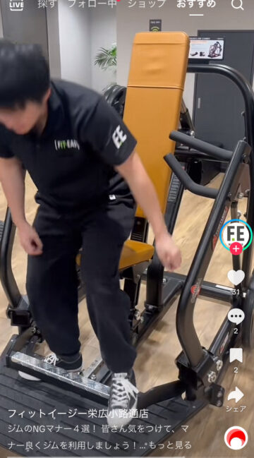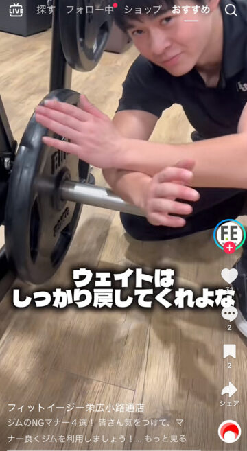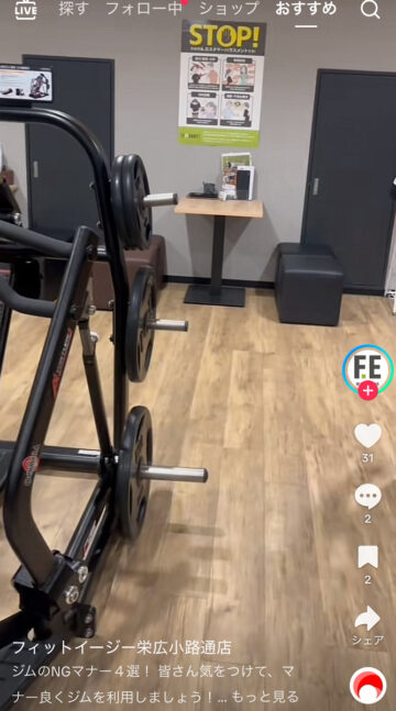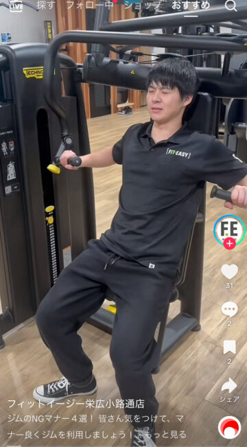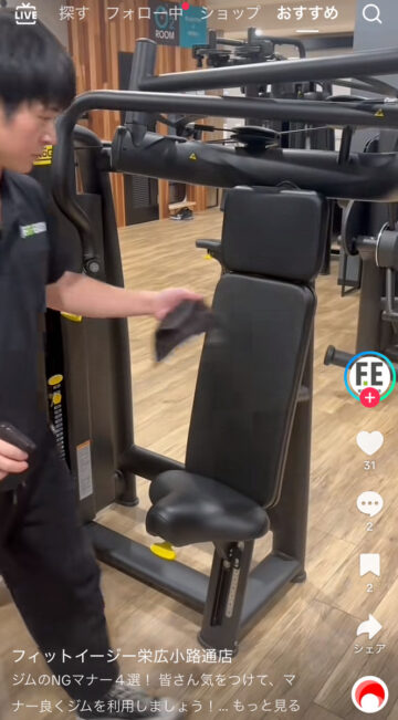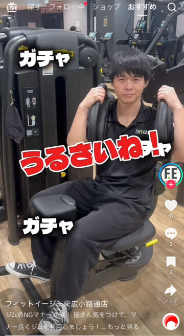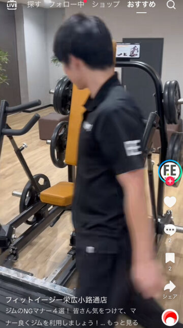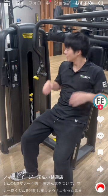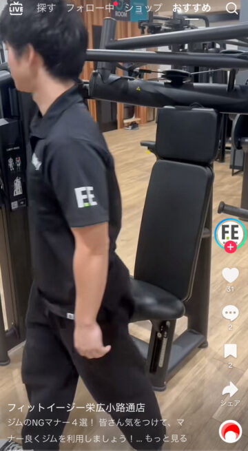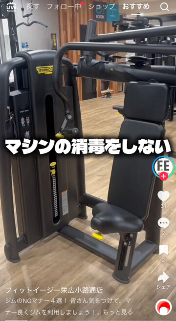 スポーツジムでのNG行為について、フィットイージー栄広小路通店の公式TikTokアカウントが紹介しています。