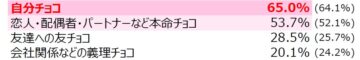 「バレンタインチョコは誰のために買う予定ですか?」という質問をしたところ、「自分」が65%で、「恋人・配偶者・パートナーなどの本命」(53.7%)、「友達」(28.5%)、「会社関係などの義理」(20.1%)を超えて最多となりました。