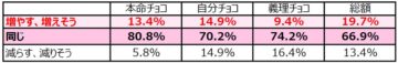 「バレンタインチョコの予算について昨年と比較すると?」を聞くと、「自分」については「増やす、増えそう」と「減らす、減りそう」が共に14.9%、「本命」については「増やす、増えそう」が13.4%、「減らす、減りそう」が5.8%。一方、「義理」に対しては「増やす、増えそう」が9.4%、「減らす、減りそう」が16.4%という結果になりました。同社は「義理チョコ」について「縮小傾向にあることがうかがえる」と分析しています。