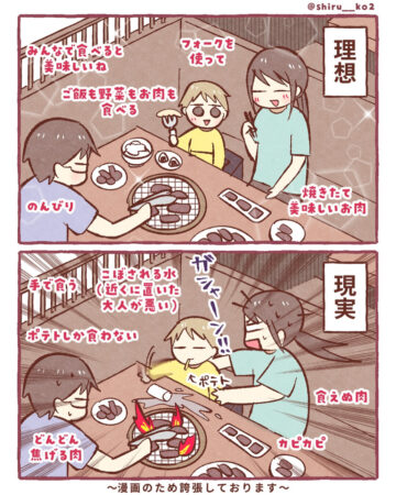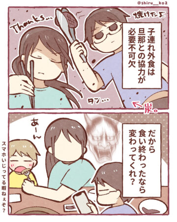 フリーランスイラストレーターのしる子さんの漫画「2歳児 子連れ外食 こんな感じ…」がインスタグラムで5700以上の「いいね」を集めて話題となっています。
