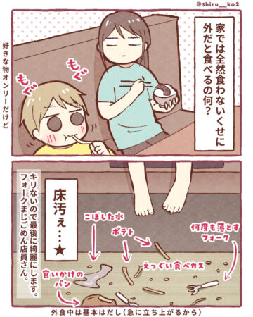 【漫画】突然立ち上がる、何度もフォークを落とす… 2歳児との“外食あるある”に「分かりすぎる!」と共感の嵐