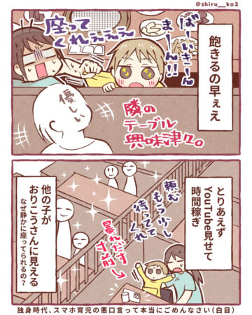 しる子さん「息子が2歳5カ月になり、最近はだいぶ落ち着いてきましたが、結構大変でした。分かっていることだし、仕方のないことなのですが、料理がくる前に飽きてしまったり、フォークやスプーンを何度も落としたり、急に立ち上がったり。元々スマホ育児には反対派でしたが、外食時で大変なときは『スマホで動画を見てもよい』というルールを作って、臨機応変に対応しています」