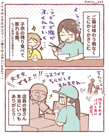 しる子さん「『分かりすぎる~!』という共感のコメントをいただきました。また、子連れで外食をする際にお勧めのお店を教えていただいたり、実際に飲食店で働いている方々からは、『お子さま連れのお客さま大歓迎なので、気にせず来てくださいね』といった優しいお言葉をいただいたりしました」