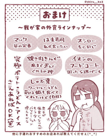 しる子さん「周囲のお客さんと店員さんへの配慮です。店内で走り回らないようにする、落とした物は必ず拾う、床が汚れたら最後にまとめて片づけるなど。当たり前のことだけれど、ご迷惑をおかけしないように心掛けています」