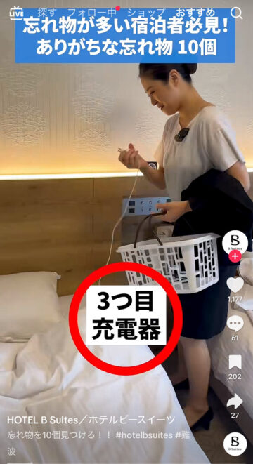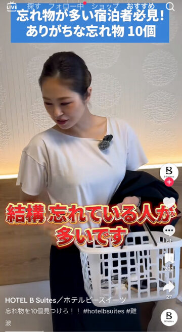 旅行や出張でホテルに泊まった際、忘れ物をしてしまい、困った経験はありませんか。ホテルの客室内でよく見つかる忘れ物について、ホテルビースイーツ(大阪市中央区)が公式TikTokアカウントで紹介しています。