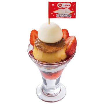 メニューは、「いちごと雪見だいふくのパフェ」「いちごと雪見だいふくのプリンサンデー」「あったかひんやり!いちごと雪見だいふくとりんごパイ」「雪見フルーツだいふく」がラインアップ。
