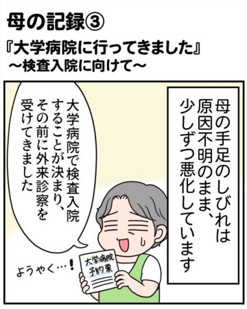 手足のしびれを感じて病院を受診したものの、「異常なし」と診断された60代の母。しかし症状は悪化し、ほとんど歩けない状態になってしまいました。病名を確定させるために検査入院をしたところ…という内容で、読者からは「大変だけど頑張って」「病院に行くきっかけになりました」などの声が上がっています。