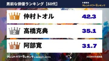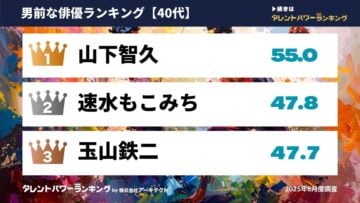 調査では、国内で活動するタレントから1280人をリストアップし、名前を知っている・顔も知っているといった「認知度」、見たい・聞きたい・知りたいといった「誘引率」をもとに「パワースコア」を算出。調査は、1年に4回(2月、5月、8月、11月)行われ、今回のランキングは、2024年・2025年度に調査を実施した各俳優の最新データを使用。